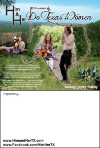 Him & Her is currently promoting “Him & Her Do Texas Women” (2018), the duo’s third album release. Him & Her is a bluesy, jazzy, folksy duo playing primarily original music, featuring singer-songwriter Brenda Freed on vocals, and guitar or piano and Michael D’Eath (“DEE-uth”) on diatonic or chromatic harmonica. Michael’s tasty harmonica and Brenda’s soulful & versatile voice delight house concert, theater and festival audiences. Him & Her performs as a trio with Jonathan Lee on lead guitar, or as a full band with percussion, bass and harmony vocals.  Him & Her devotes their creative energies to performing, recording, songwriting, musical arrangement, and teaching, as well as having a good time with live audiences whether playing a club, house concert, small theater or festival.