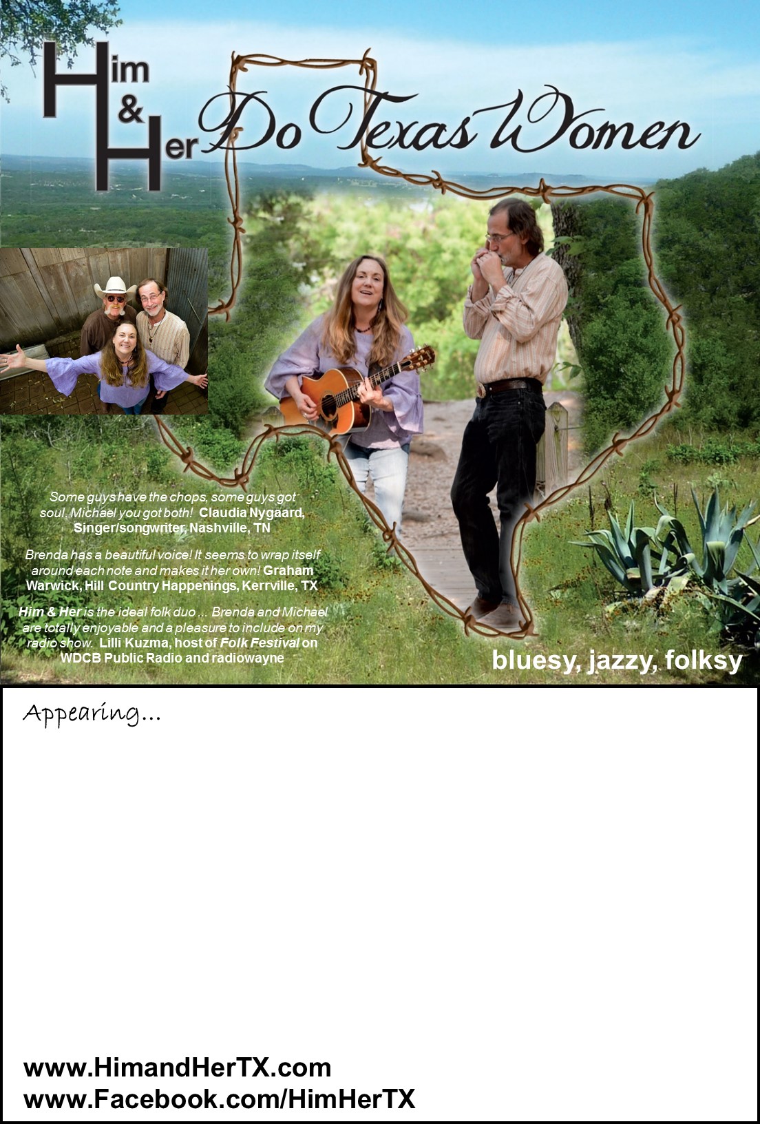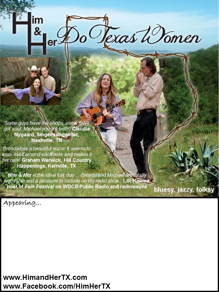Him & Her is currently promoting “Him & Her Do Texas Women” (2018), the duo’s third album release. Him & Her is a bluesy, jazzy, folksy duo playing primarily original music, featuring singer-songwriter Brenda Freed on vocals, and guitar or piano and Michael D’Eath (“DEE-uth”) on diatonic or chromatic harmonica. Michael’s tasty harmonica and Brenda’s soulful & versatile voice delight house concert, theater and festival audiences. Him & Her performs as a trio with Jonathan Lee on lead guitar, or as a full band with percussion, bass and harmony vocals.  Him & Her devotes their creative energies to performing, recording, songwriting, musical arrangement, and teaching, as well as having a good time with live audiences whether playing a club, house concert, small theater or festival.